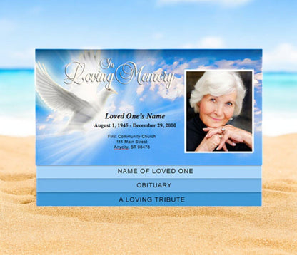 The Peace 8-Sided Graduated Bottom Fold Template offers a calm and spiritual design, ideal for honoring a loved one with a sense of grace and serenity. A peaceful dove, symbolizing hope and eternal rest, is depicted soaring beneath radiant light in a clear blue sky. The soft shades of blue create a comforting backdrop, while the bottom-fold format features personalized tabs for each section of the program, allowing for organized and easy navigation.
