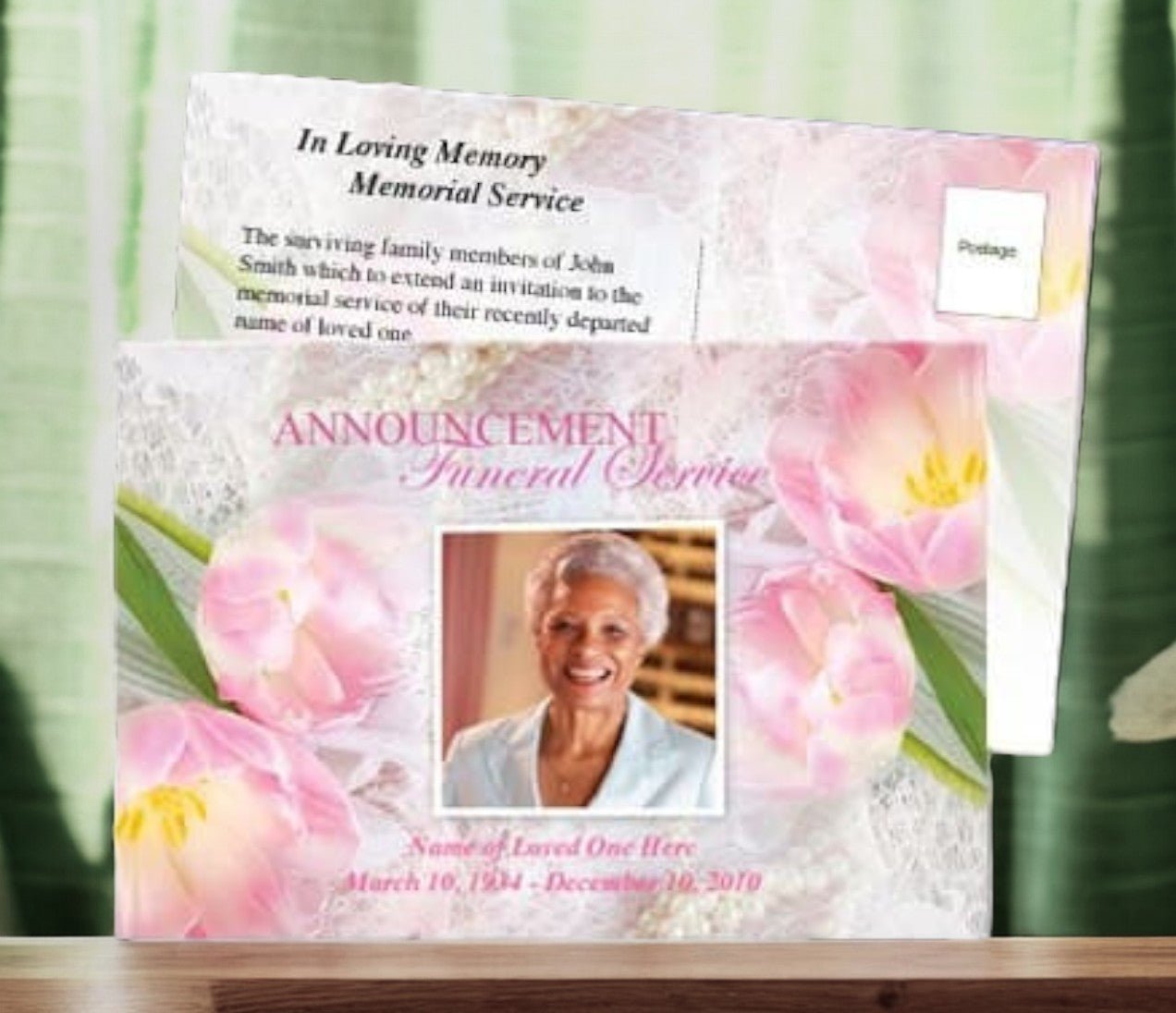 The Pearls Funeral Announcement Postcard Template exudes elegance and softness with its tasteful design featuring pink tulips set against a delicate white lace background. This graceful combination creates a serene and comforting atmosphere, perfect for honoring a loved one’s memory. The Pearls Funeral Announcement Postcard Template offers a refined way to share funeral or memorial service details with beauty and tenderness.