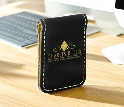 Laser engraved with up to three lines of your personalized text or funeral home logo in a striking gold finish, this belt clip delivers both function and flair. Measuring 1¾" x 2½" in a black and gold design, it makes a meaningful and stylish keepsake.