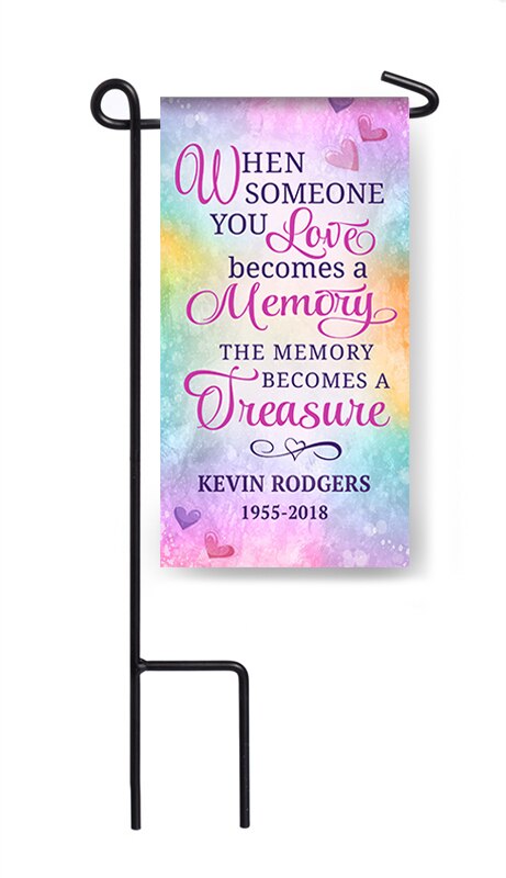 The Funeral Program Site presents our sweet personalized mini memorial flag, delicately crafted in soft pastel tones and set against a gentle watercolor background. Subtle heart accents surround the heartfelt funeral poem, which reads, "When someone you love becomes a memory, the memory becomes a treasure."