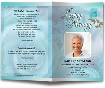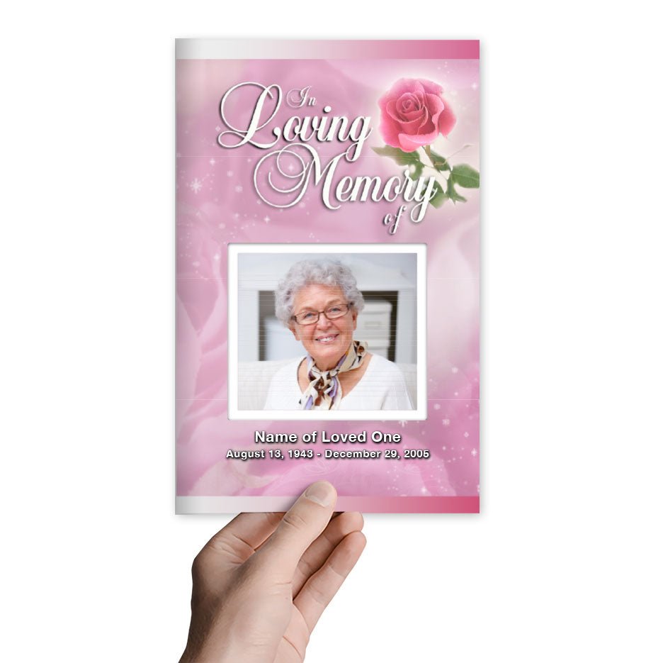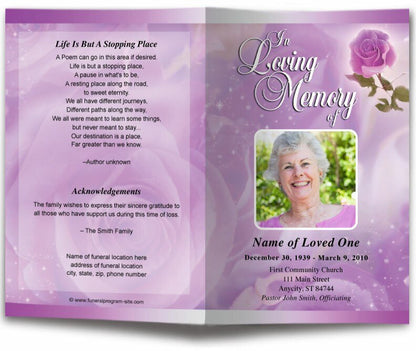 The Petals Funeral Program Template is a beautiful choice for honoring a loved one with elegance and grace. The front cover features a delicate background of rose petals, complemented by a soft gradient ribbon and gentle sparkles at the top and bottom. A single rose accent adds a personal touch, making this program a lovely and fitting tribute. The back of the Petals Funeral Program Template continues the soft, floral theme, ensuring a seamless design throughout.
