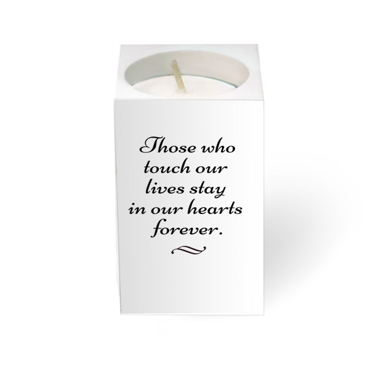 The back features the heartfelt memorial quote, "Those who touch our lives, remain in our hearts forever," accented with a graceful swirl, adding a tender and meaningful touch. Perfect for home displays, memorial spaces, or special ceremonies, this tea light candle holder combines personalization, sentiment, and elegant design to create a lasting keepsake in honor of a loved one’s memory.