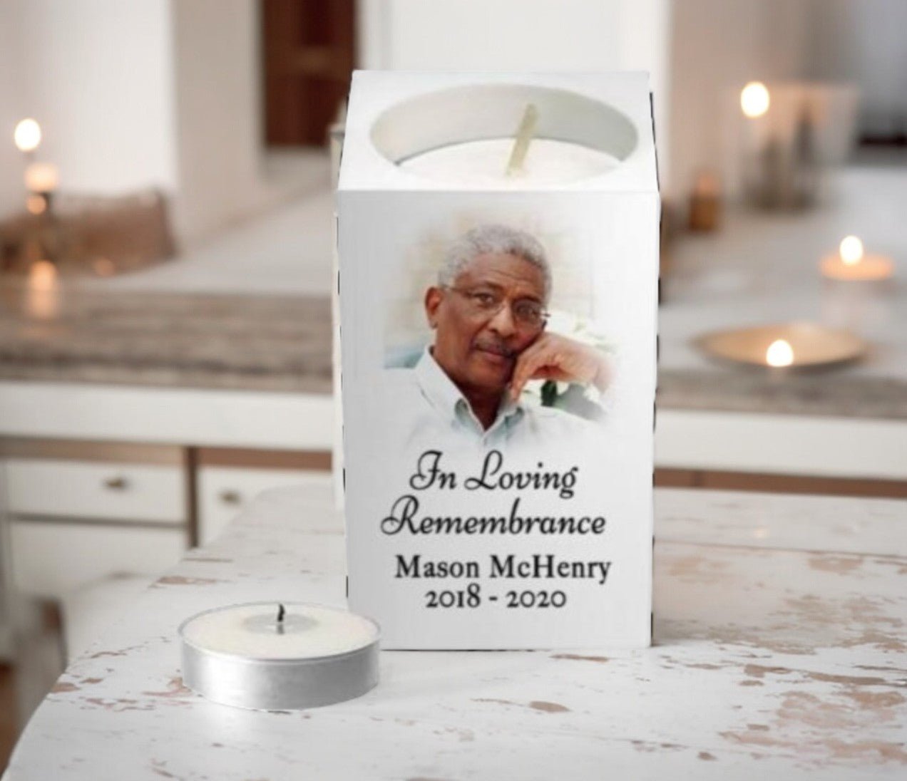 Celebrate and remember a cherished loved one with the Photo Vignette Mini Memorial Tea Light Candle Holder from The Funeral Program Site. The front prominently displays your submitted photo with softened edges, creating a gentle and focused tribute, while up to three lines of your personalized text appear beneath the image.