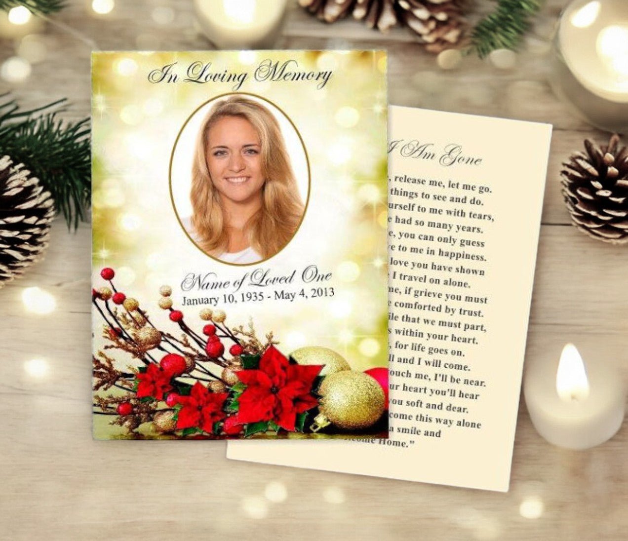 On the back panel of the Ponsietta Small Memorial Card Template, a text box with a coordinating red and gold background offers space for a personal message, poem, or tribute. The elegant Ponsietta Small Memorial Card Template color palette and thoughtful design make this memorial card a meaningful keepsake that celebrates the life and legacy of the deceased.