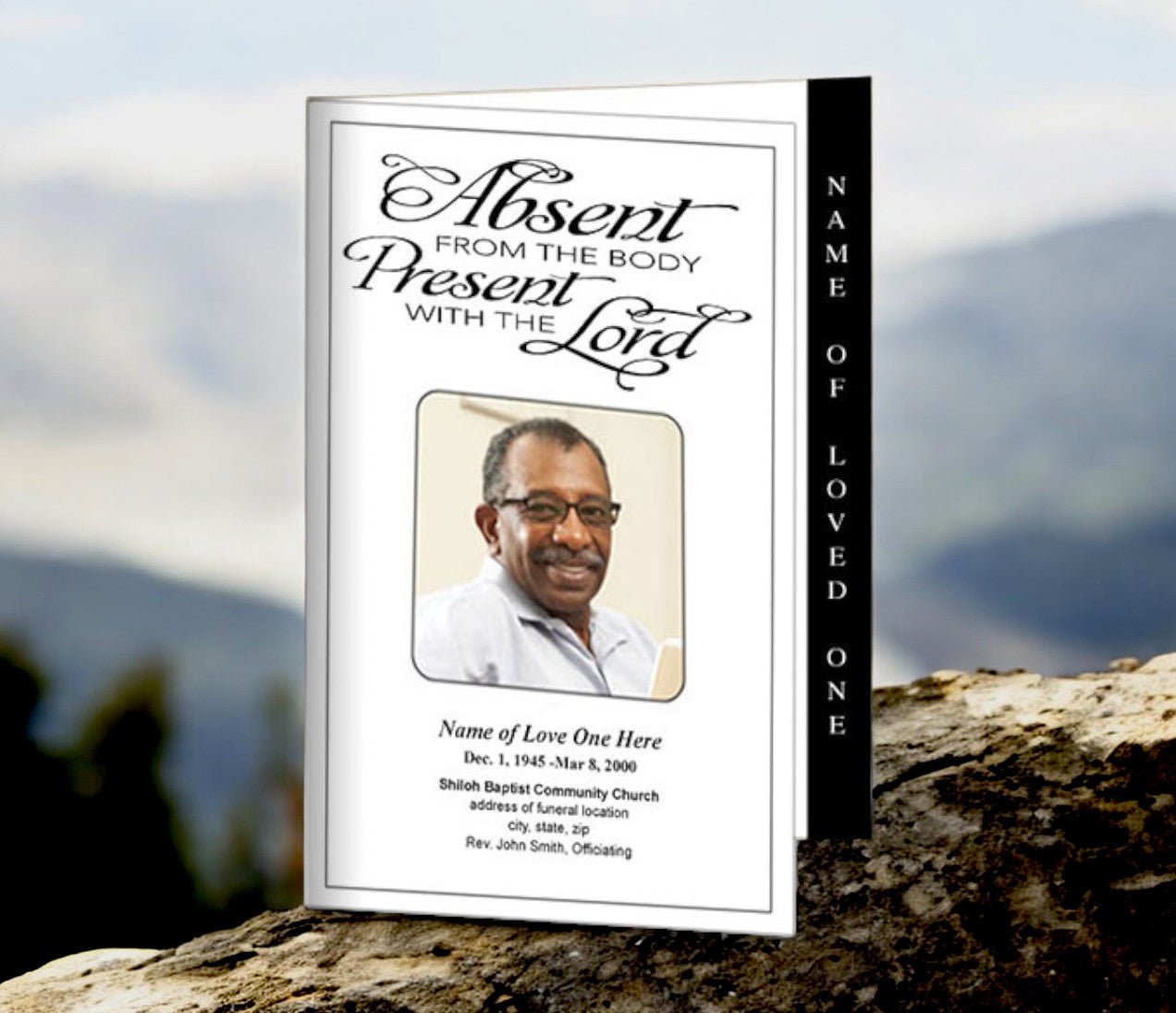 The Present 4-Sided Graduated Funeral Program Template is a classic, faith-based design adorned with a thin border and inspirational word art reading "Absent From The Body Present With The Lord." This template provides a serene and uplifting setting for honoring loved ones, reflecting a strong spiritual message. The design is ideal for those who cherish faith and seek a dignified way to celebrate a life of devotion.