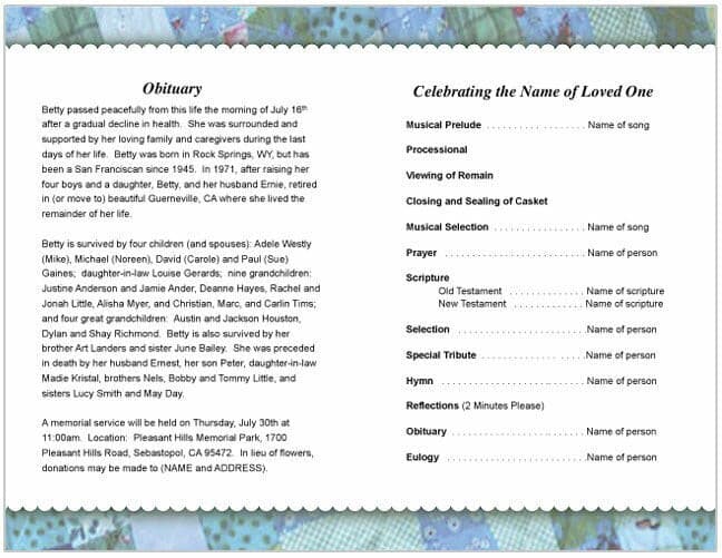 On the back cover, a matching quilt-themed design with a transparent overlay provides space for poems, tributes, and funeral service location details. Inside, the Quilt Funeral Program Template maintains a cohesive and elegant theme, featuring a complementary background and a colored frame to neatly organize service details, personal messages, and cherished photos. Whether printed at home or professionally, this template serves as a lasting and meaningful keepsake, celebrating a life filled with creativity, warmth, and love.