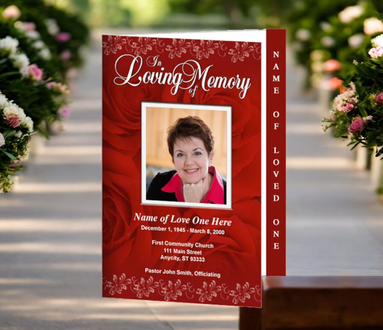 The Red Passion 4-Sided Graduated Funeral Program Template presents a rich and elegant tribute, designed with a velvety red floral background that evokes love, beauty, and remembrance. Petite floral accents along the top and bottom border add delicate charm, while an inset frame on the front cover highlights your loved one’s photo with grace. The Red Passion 4-Sided Graduated Funeral Program Template offers a heartfelt way to celebrate a cherished life with warmth and dignity.
