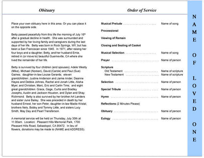 The reverse of the template maintains the reflective backdrop, providing a perfect space for adding a poetic verse or concise obituary/biography. This design ensures a respectful and meaningful tribute that reflects the beauty of nature, making it ideal for creating a lasting memorial that celebrates cherished memories in a dignified manner. The Reflection 4-Sided Graduated Funeral Program Template is a thoughtful way to honor your loved one's memory with a beautiful, customizable design.