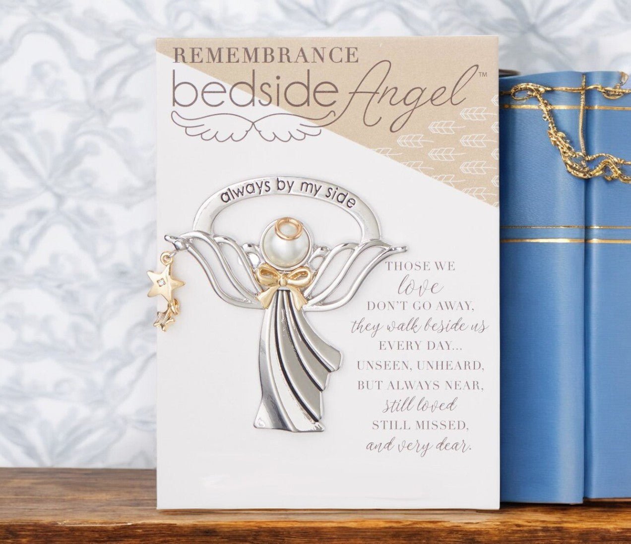 From The Funeral Program Site, this beautifully crafted memorial angel is engraved with the phrase "Always by my side" across the top, offering a touching reminder of lasting love and presence. The angel features a pearl-like face with a delicate gold halo and bow, along with two shiny stars that gracefully dangle from the left wing, adding a hint of sparkle and charm.