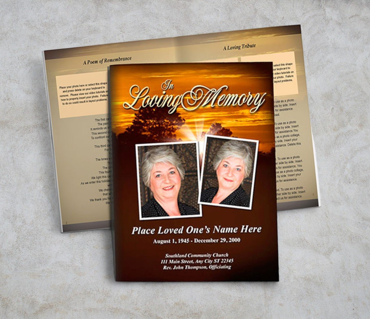 Funeral booklets formatted in an 8-page or 8-sided layout (2 sheets printed front and back). Add more pages if needed. Ready to edit and print on your own home printer or local copy shop.