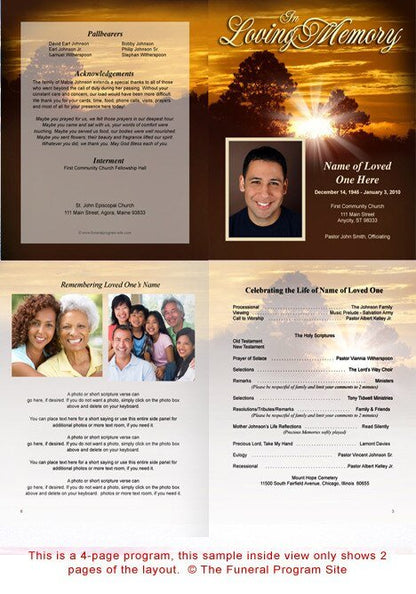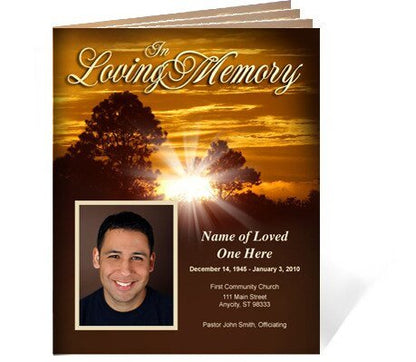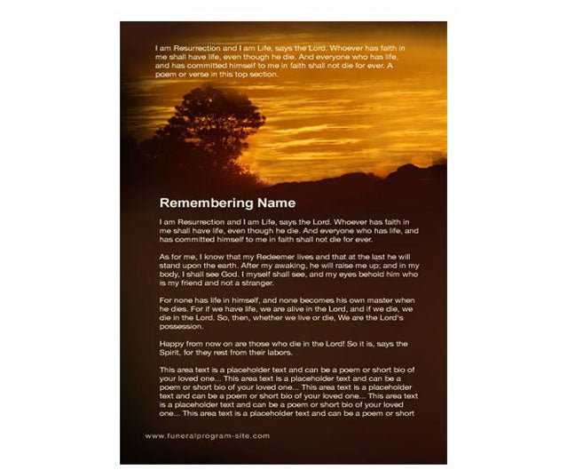 The Renewal Funeral Booklet Template offers a vibrant and uplifting tribute, featuring a vivacious sunrise ascending a hillside as a new day begins. This beautiful scene symbolizes renewal, hope, and the promise of new beginnings, making it an ideal choice for honoring a loved one’s life and legacy. The Renewal Funeral Booklet Template beautifully captures the essence of life's continual cycle and the peaceful transition from one chapter to the next.