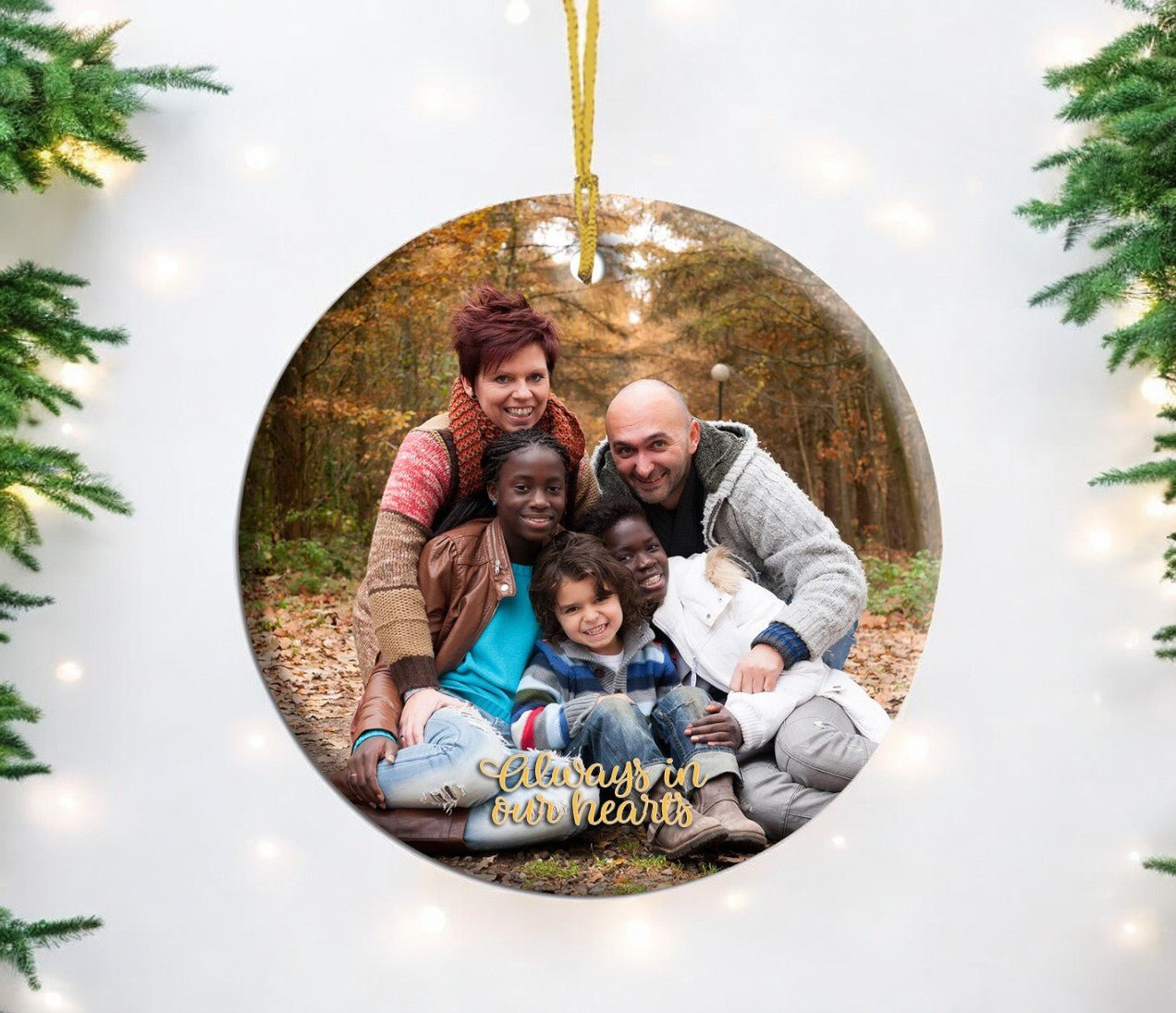 This special in loving memory Christmas ornament provides your full or b/w photo imprinted directly onto our ceramic circular round ceramic shape. A great memorial piece during the holidays that reflects a loved one's presence is near. Includes gold hang tag ready to place on your tree or hang in your home for display all year round! Single Sided Printing of your chosen photo.