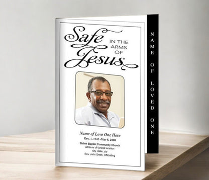 The Safe 4-Sided Graduated Funeral Program Template is a sophisticated design featuring a thin border and tasteful faith-based word art that reads "Safe In The Arms of Jesus." This template provides a serene and uplifting setting for honoring loved ones, symbolizing eternal peace and protection.
