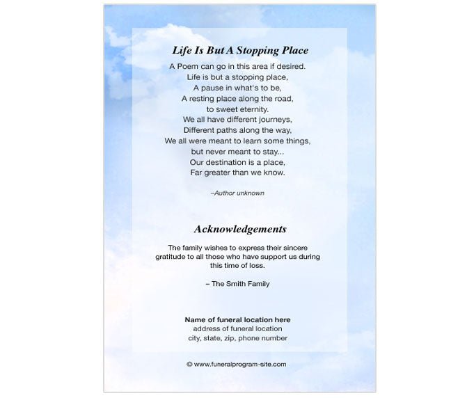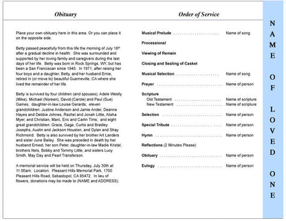 The Salvation 4-Sided Graduated Funeral Program Template continues its elegant theme on the back with a white overlay, perfect for adding a brief biography or poem. Predominantly featuring light blues, this template is ideal for creating a meaningful keepsake that reflects the spiritual essence of the service. The Salvation 4-Sided Graduated Funeral Program Template is a thoughtful way to honor your loved one's faith and legacy, providing a lasting tribute for family and friends.