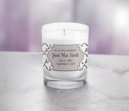 This sweet memorial votive candle offers a lovely damask and leafy style diamond pattern background set behind a handsome angular frame for your text. Keep your loved ones' memories close with Sanders Personalized Votive Memorial Candle. Its stunning design features a diamond pattern background and an angular frame for your chosen text. It's a beautiful way to honor those who have passed.