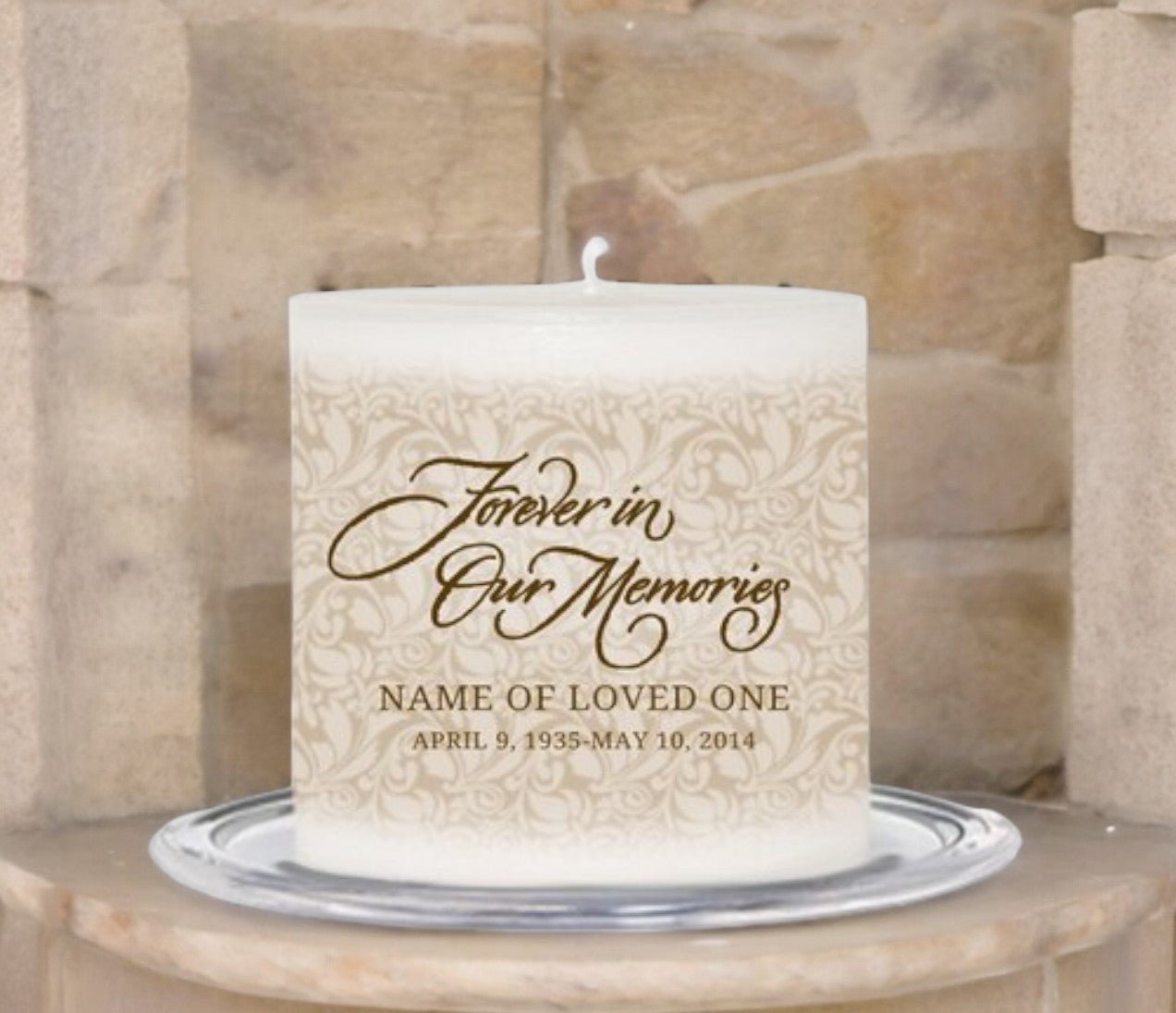 This small wax memorial candle features a warm tan flourish design with the title Forever In Our Memories displayed on the front, along with space for your personalized text. Add a name, dates, or short sentiment to create a thoughtful tribute that reflects the life and love you wish to honor.