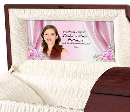 Designed to perfectly fit your casket, it provides a refined and elegant backdrop for your cherished photo and personalized text. Thoughtfully crafted to blend beauty, personalization, and heartfelt sentiment, the Pink Satin & Roses Custom Casket Panel Insert transforms a final resting place into a meaningful tribute, offering family and friends a lasting keepsake that celebrates treasured memories and honors a life well-lived.