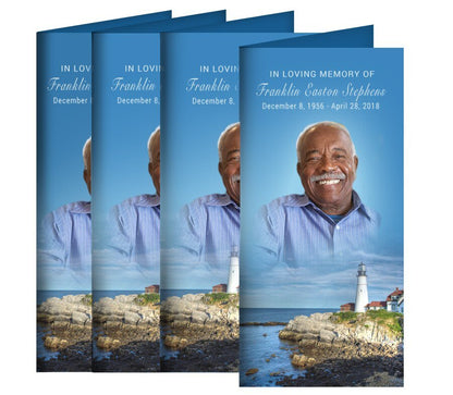 This long fold funeral program from The Funeral Program Site features a striking lighthouse set along a cliffside horizon, overlooking calm ocean waters. The picturesque coastal scene evokes strength, guidance, and tranquility, creating a meaningful and majestic backdrop for honoring a loved one. Designed in a vertical letter-size format, the long fold or tea fold layout offers a unique variation from the traditional bifold program. Its slimmer, elongated shape provides an elegant and visually distinctive presentation that enhances the overall design.