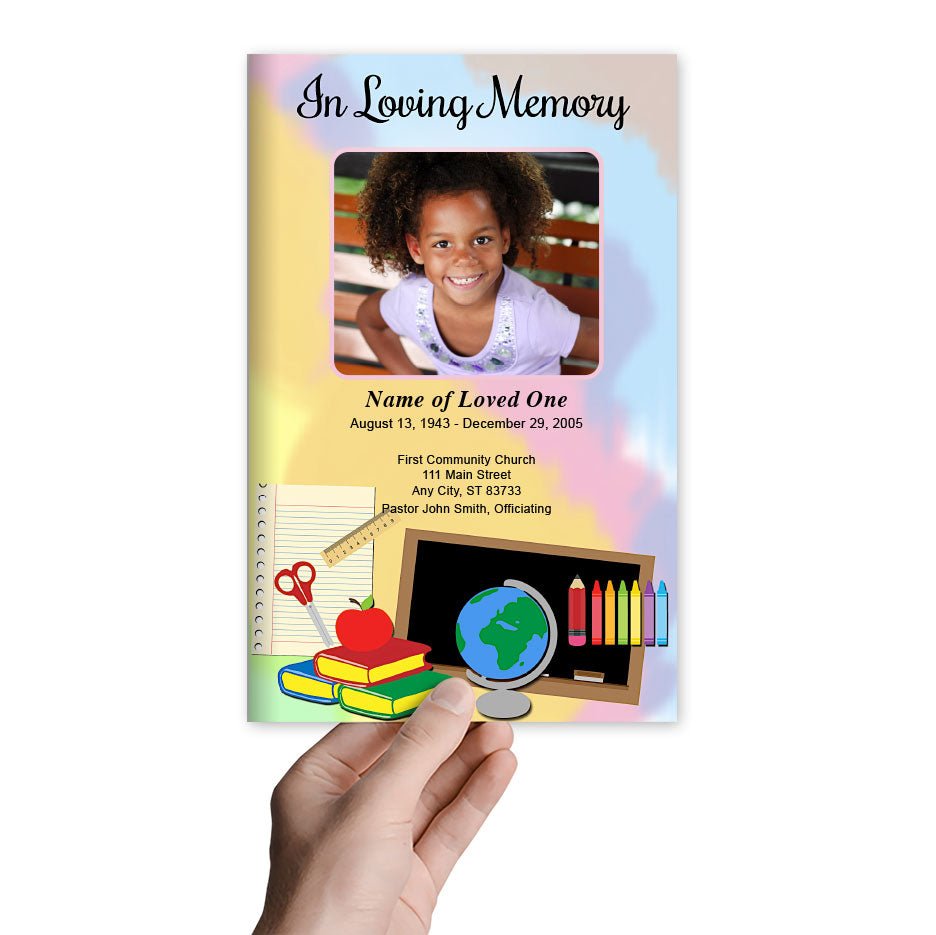 The School Funeral Program Template offers a nostalgic and heartfelt tribute, featuring a children's school and learning theme set against a soft, pastel-painted background. This design is perfect for honoring a young life, reflecting the joy of learning and the innocence of childhood.