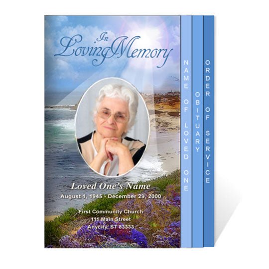 The Seascape 8-Sided Graduated Program Template features a soothing coastal design, with rays of light shining above a serene seascape to frame your loved one’s photo on the front cover. This peaceful visual evokes a sense of comfort and hope, making the Seascape 8-Sided Graduated Program Template a heartfelt choice for honoring someone who appreciated the calm and beauty of nature. Its tranquil tones and coastal elements provide a soft backdrop for a memorable tribute.