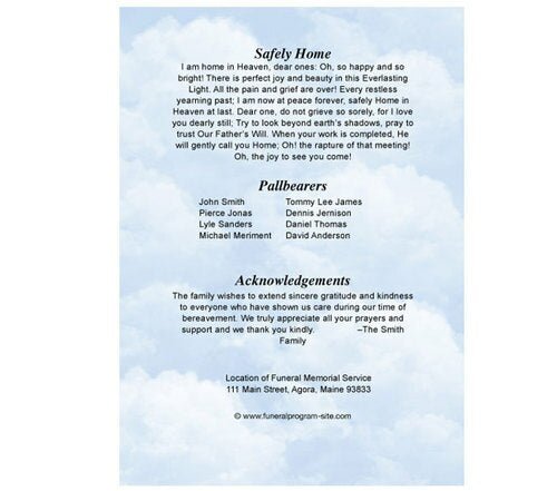 The reverse side of the Seascape 8-Sided Graduated Program Template continues the natural theme with a cloud-filled sky and a white transparent overlay, ideal for including acknowledgements, pallbearers, or a final message. The interior panels are clearly labeled to guide readers through each section of the service. This template is a graceful keepsake, offering a sense of peace and lasting remembrance through the elegance of land, light, and sea.