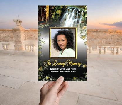 The Serene Funeral Program Template presents a peaceful and elegant design, featuring a lush garden setting with a cascading waterfall surrounded by vibrant green foliage. This tranquil and nature-inspired backdrop offers a soothing and heartfelt tribute, symbolizing renewal, peace, and eternal rest. The front cover is adorned with a golden frame, elegantly encircling a photo of your loved one, creating a graceful and dignified presentation.
