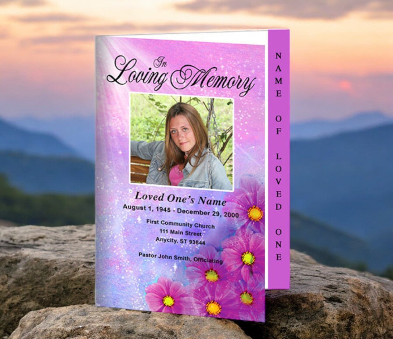The "Sparkle 4-Sided Graduated Funeral Program Template" is a beautifully designed template that captures the essence of the individual being memorialized with soft light rays. The template features a photo framed with floral embellishments, adding a touch of elegance and personalization.