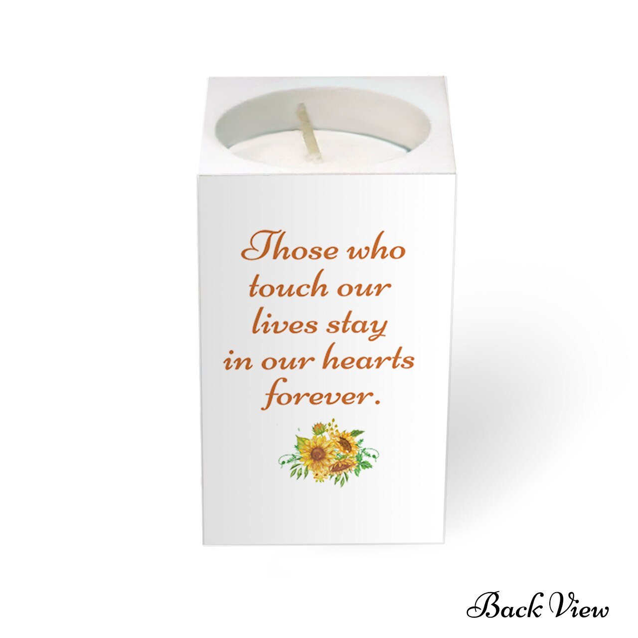 On the back, the touching quote, "Those who touch our lives, remain in our hearts forever," is complemented by a coordinating cluster of sunflowers, adding a warm and meaningful touch. Perfect for home displays, memorial spaces, or special ceremonies, this tea light candle holder blends sentiment, personalization, and vibrant floral beauty, providing a lasting keepsake to honor and celebrate a loved one’s life.
