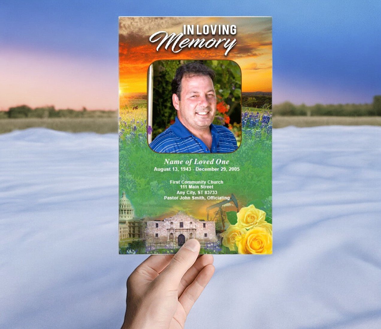 The Texas Funeral Program Template features a picturesque landscape showcasing iconic symbols of Texas, making it a perfect tribute for anyone with a connection to the Lone Star State. The front of the template highlights Texas-themed elements set against a sunset backdrop, capturing the essence of the state's natural beauty.