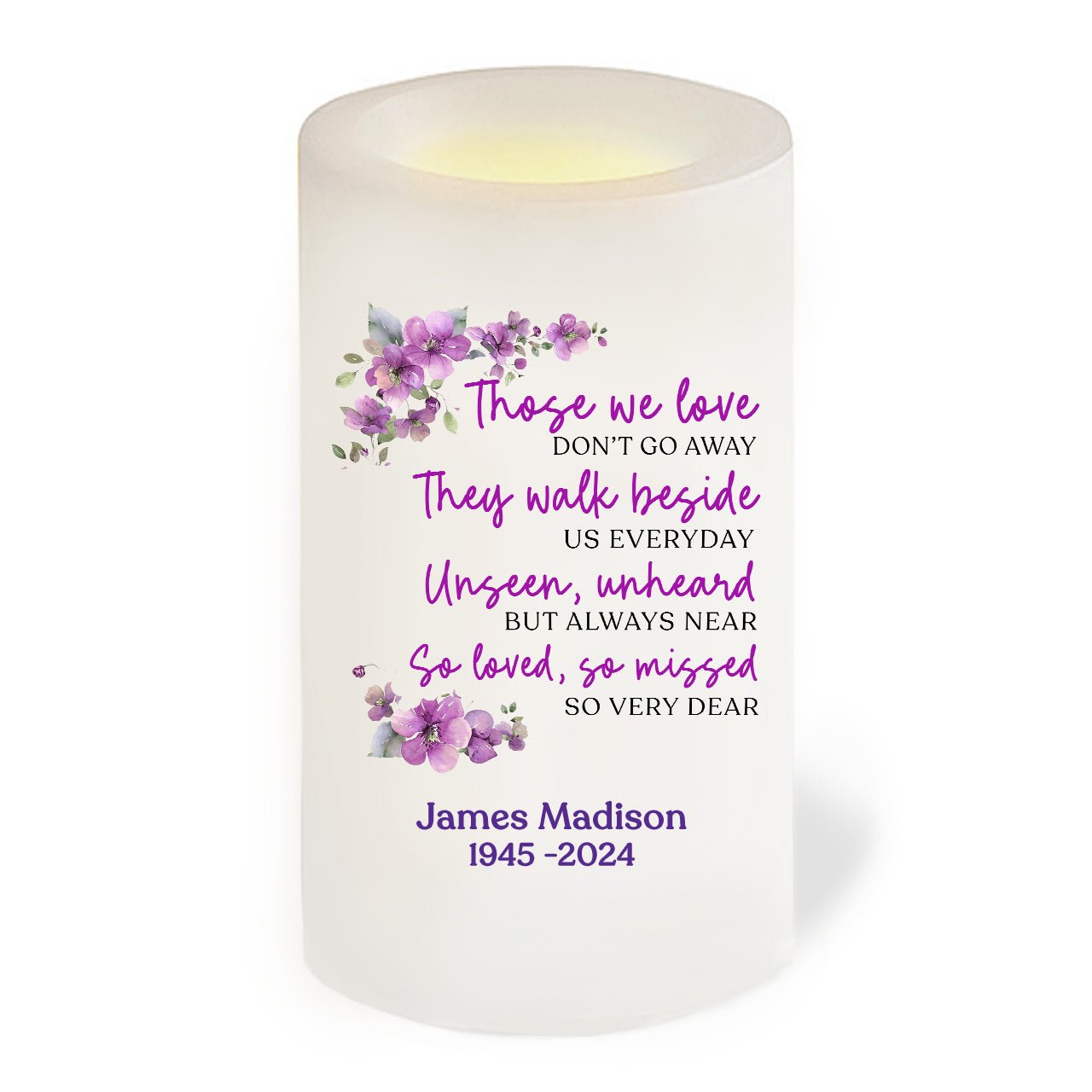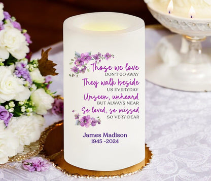 The Personalized Those We Love Flameless LED Memorial Candle is a touching tribute to honor the memory of a loved one. Featuring a comforting message and elegant floral accents, this candle provides a gentle glow, symbolizing enduring love and remembrance. Personalized with the name and dates of the departed, it offers a heartfelt way to keep their memory close without the need for an open flame. This flameless candle is perfect for home displays, memorial services, or as a sympathy gift, bringing warmth and comfort to those in mourning.