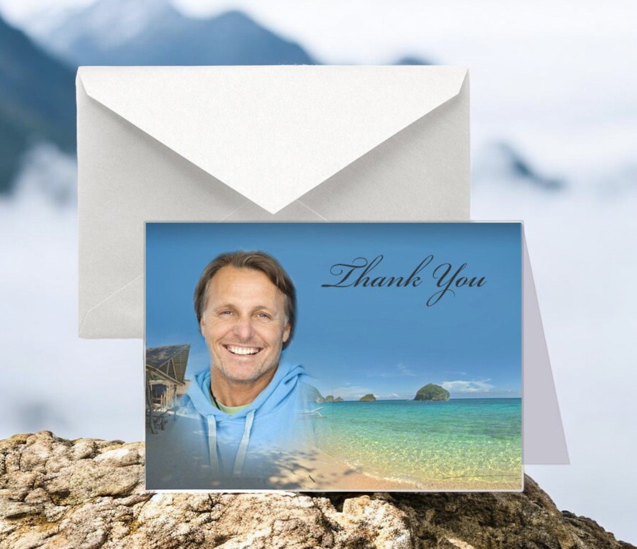 Tropical Funeral Thank You Card Design & Print offers a serene island-themed tribute with a calming waterscape of crystal-clear water, white sandy beach, and a quaint hut resting at the shoreline. This peaceful setting evokes feelings of tranquility and remembrance, making Tropical Funeral Thank You Card Design & Print a soothing way to express appreciation after a time of loss.