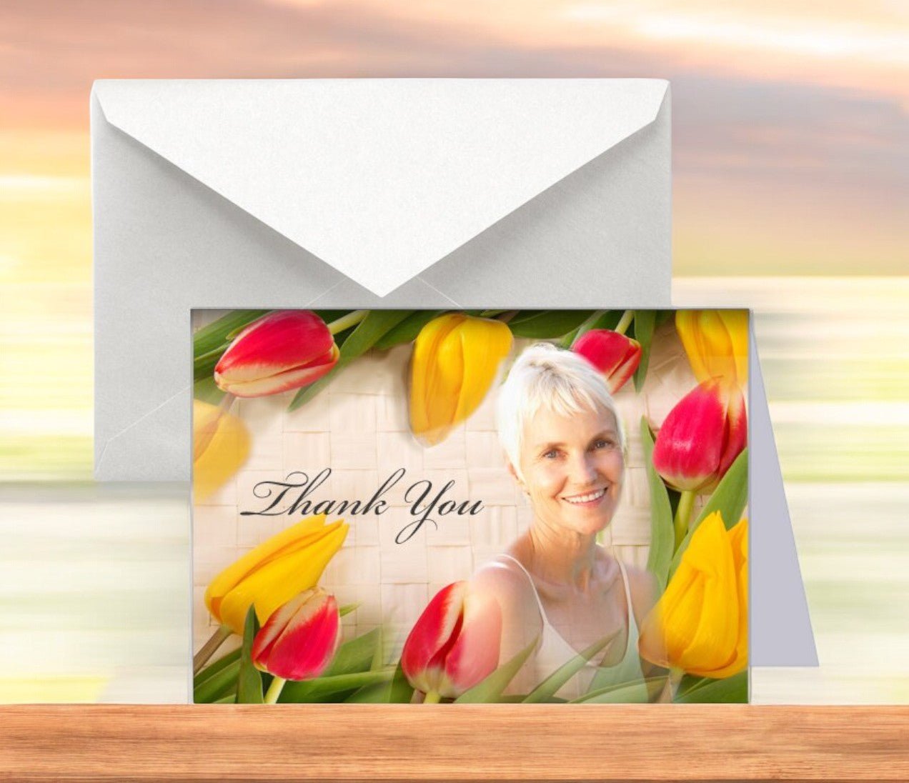 Tulips Funeral Thank You Card Design & Print features a vibrant and uplifting border of fresh springtime tulips in pink and yellow hues. Set against a softly quilted beige background, the design creates a warm and welcoming tone that reflects both appreciation and renewal. Tulips Funeral Thank You Card Design & Print is a beautiful way to express gratitude to those who offered support and kindness during a difficult time.