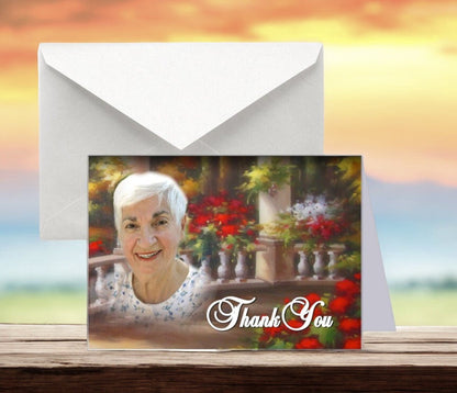 Tuscany Funeral Thank You Card Design & Print offers a warm and inviting tribute with its beautifully crafted outdoor setting. The design features a peaceful front porch with stone columns, vivid red flower blossoms, and lush green foliage, evoking the charm of a serene Tuscan garden. Tuscany Funeral Thank You Card Design & Print provides a comforting and elegant way to express heartfelt thanks during a time of remembrance.
