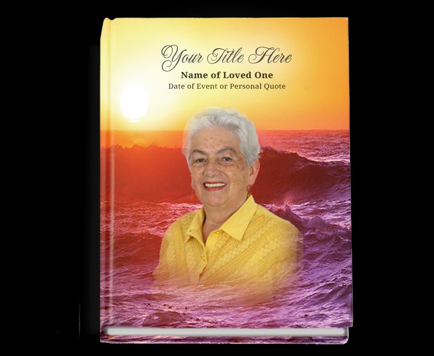 The gentle waves of the ocean during the twilight of the day sets the mood and design for this beautiful hardcover bound guest book. "The perfect way to capture the intimate memories of a loved one's service. This hardcover bound guest book reflects the peaceful, tranquil atmosphere of the ocean at twilight."