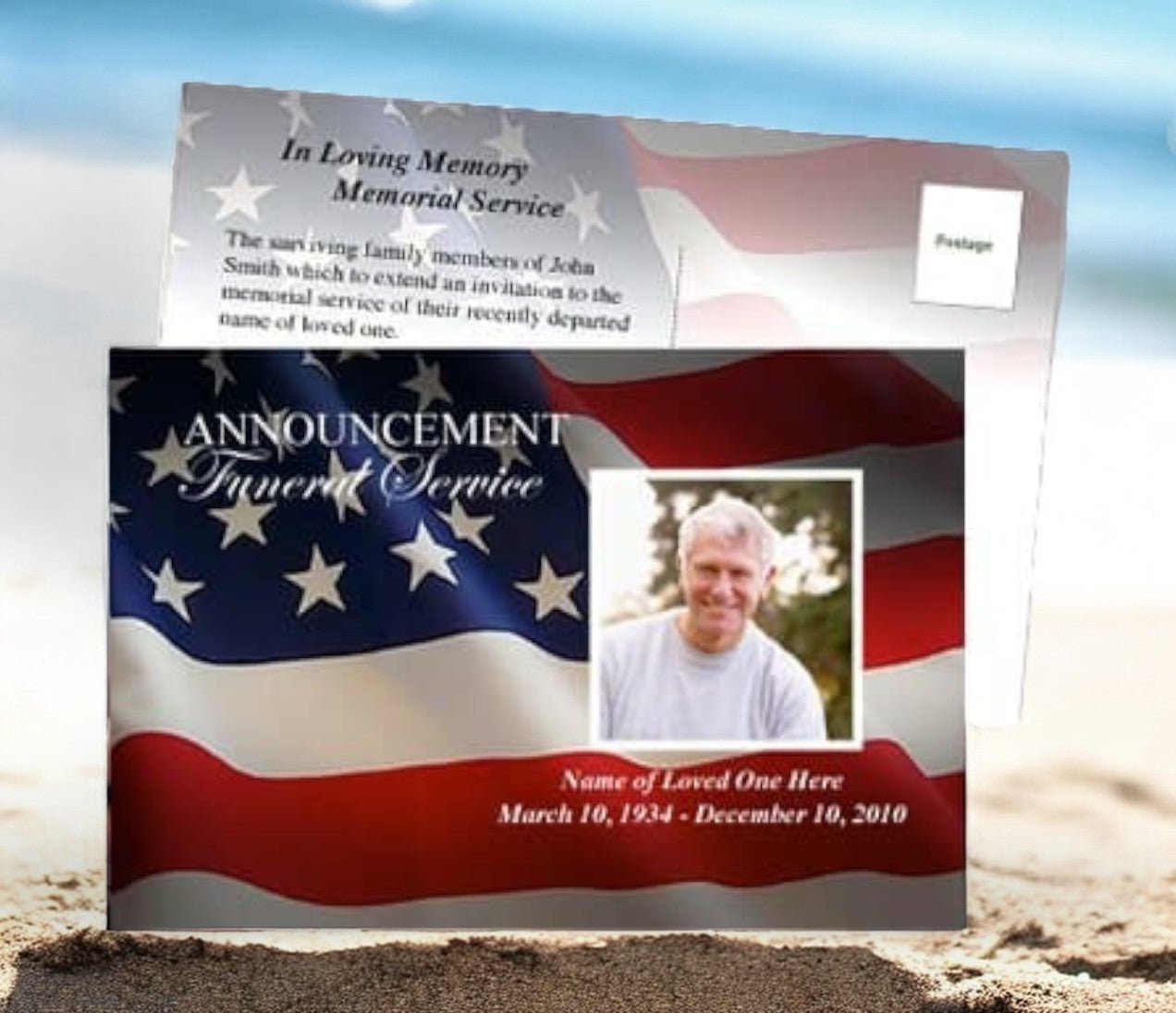 The US Flag Funeral Announcement Template is a respectful and patriotic way to honor a loved one who served in the United States Armed Forces. Featuring a bold flag-themed backdrop, this postcard design pays tribute to military service with dignity and pride. The US Flag Funeral Announcement Template is ideal for sharing memorial service details while reflecting a deep sense of national honor.
