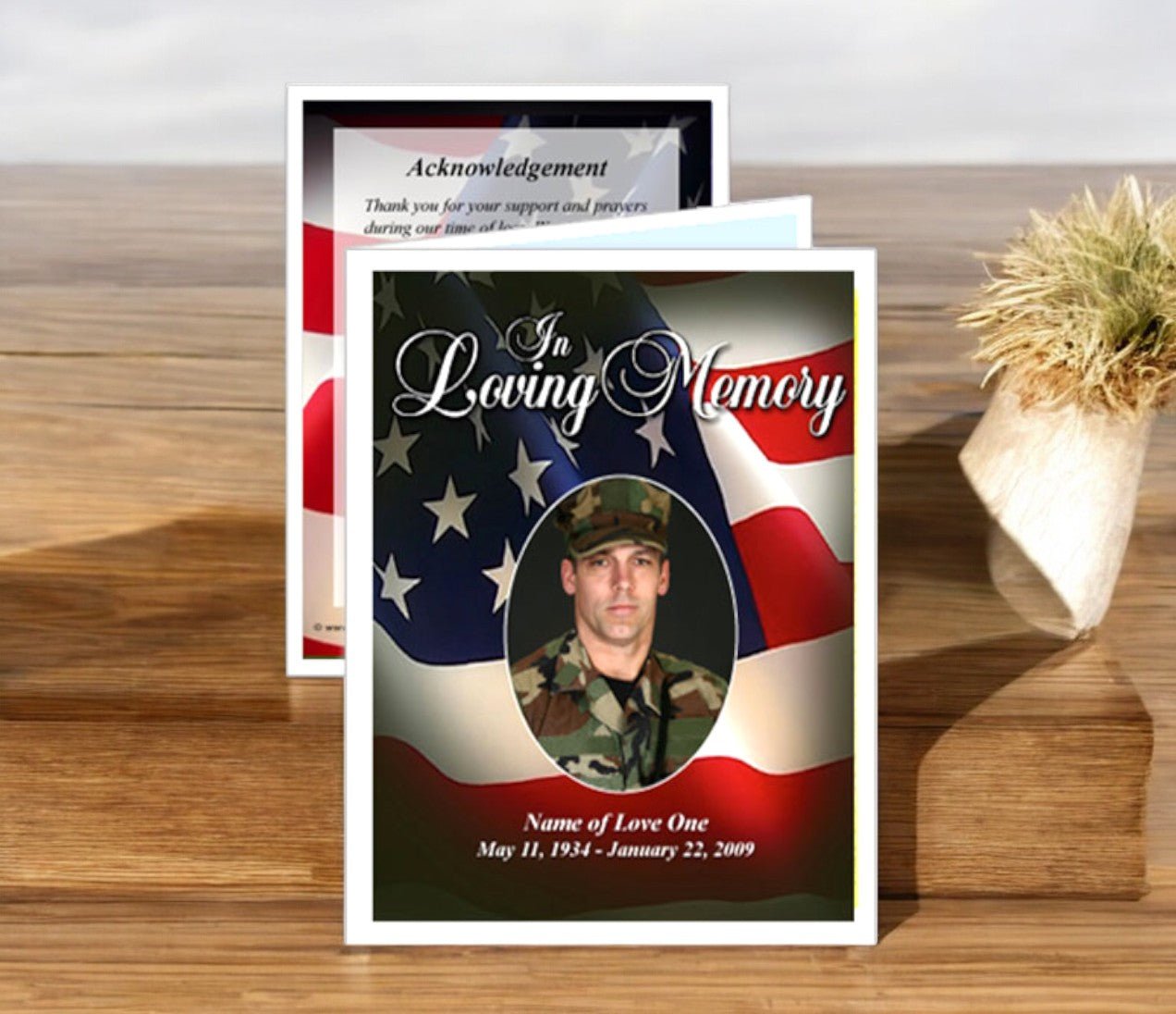 The US Flag Small Memorial Card Template is a fitting tribute for a proud patriot or an individual who served in the U.S. military. The centerpiece of the card features a photo of your cherished one set against a U.S. flag backdrop, with subtle shadows that add depth to the image. This design honors their service and commitment to their country, creating a powerful and respectful memorial.
