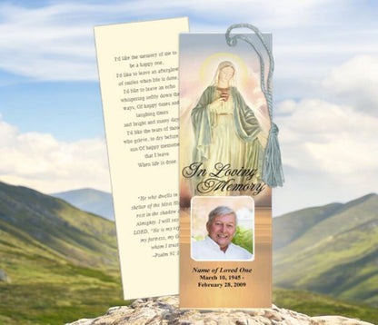 Celebrate the life of a devoted Catholic with our Vision Memorial Bookmark Template. This design features the Blessed Mother adorned with a golden halo on the front of the bookmark. Customize it with your loved one's photo, elegantly framed in either rectangle or oval on the front or back. The main colors of this Vision Memorial Bookmark Template include soft peach, yellow, and pale blue hues, creating a serene and comforting aesthetic.