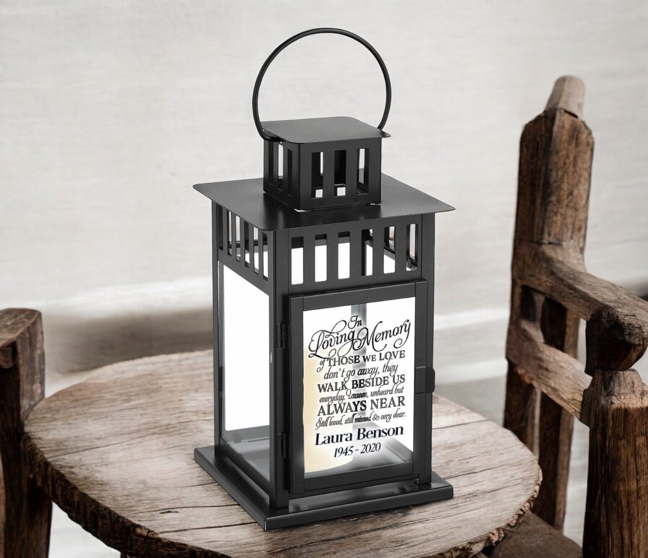 Available in your choice of a white or black metal finish, the Walk Beside Us Memorial Lantern With Wax Candle comes in two sizes—11 inches or 17.25 inches—making it perfect for display indoors or outdoors. The high-quality black lettering ensures clarity and elegance, while the included wax candle adds a soft, comforting glow, symbolizing eternal love and presence.