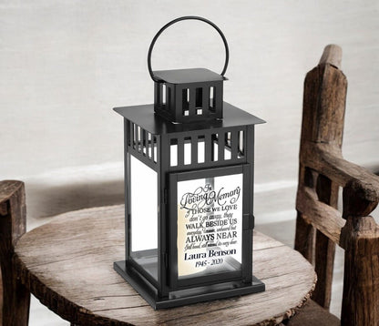Walk Beside Us Memorial Lantern With Wax Candle from The Funeral Program Site offers a touching way to honor and remember a loved one. This elegant lantern features a beautifully inscribed poem that reads, “In loving memory of those we love don’t go away, they walk beside us every day. Unseen, unheard, but always near, still loved, still missed, and very dear.” The heartfelt sentiment is complemented by two lines of personalized text beneath the design, creating a meaningful keepsake that radiates warmth and remembrance.