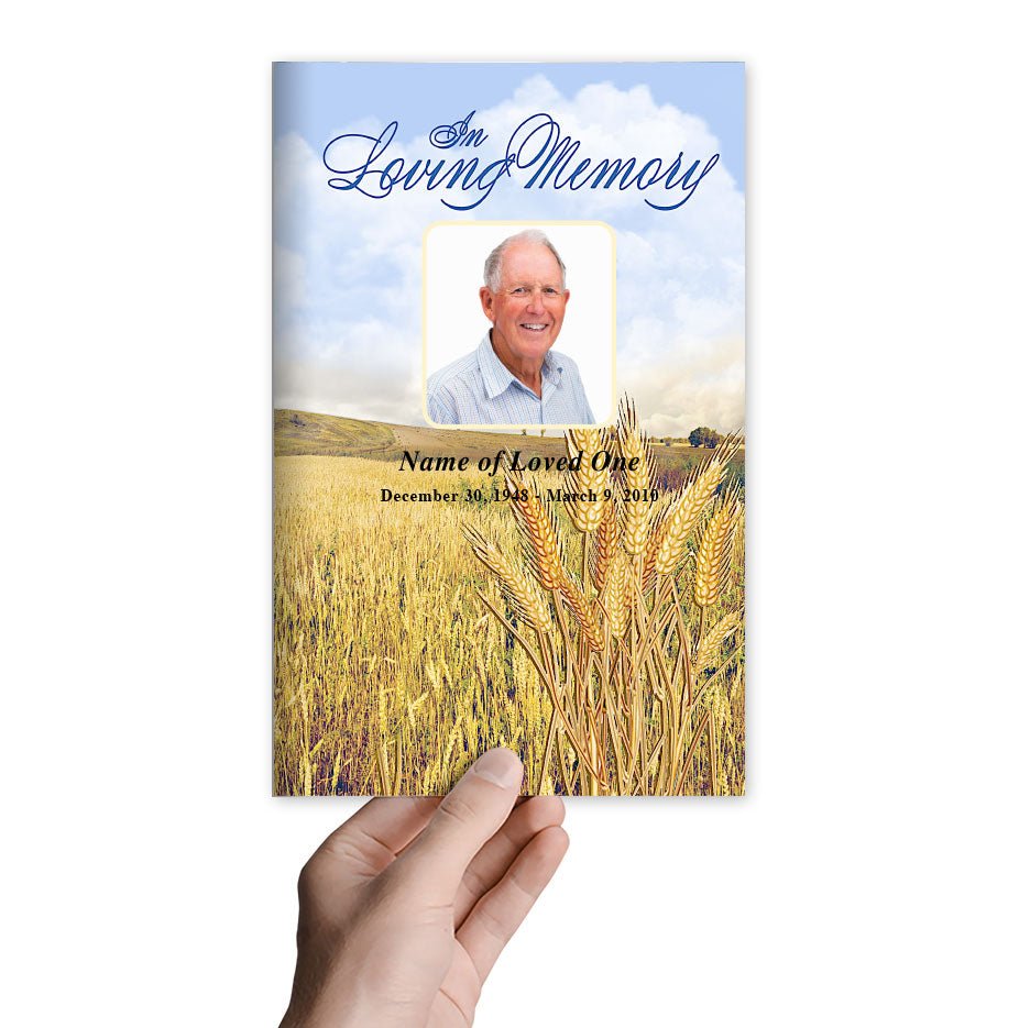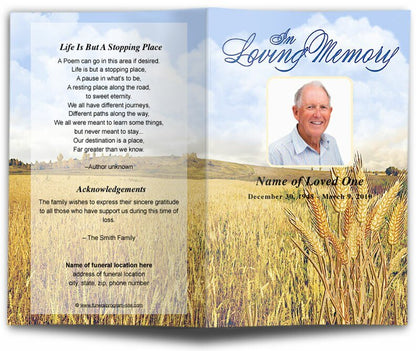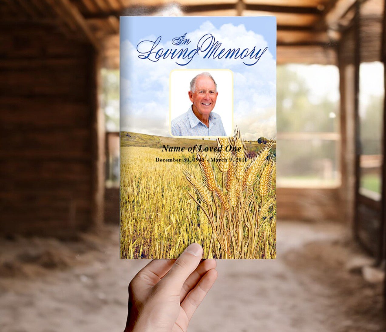 The Wheat Funeral Program Template is a warm and serene tribute, featuring a stunning midwestern wheat field set against a soft, white sky. This peaceful and natural design symbolizes growth, abundance, and the cycle of life, creating a comforting and reflective atmosphere. The front cover allows for personalization with a cherished photo and a meaningful message, ensuring a heartfelt remembrance. The Wheat Funeral Program Template provides space for a prayer, scripture, obituary, or personal tribute, making it a meaningful keepsake for family and friends.
