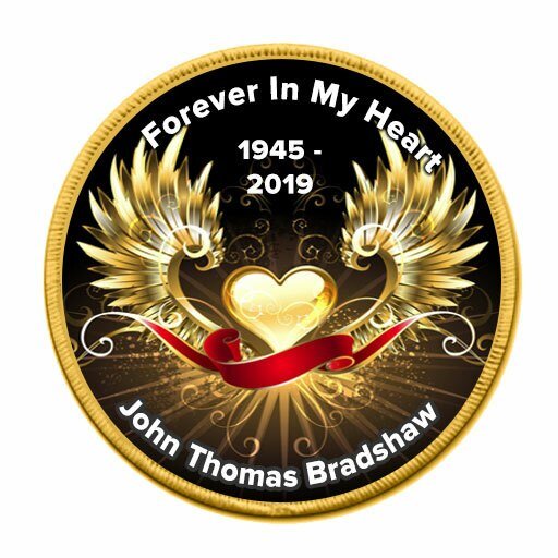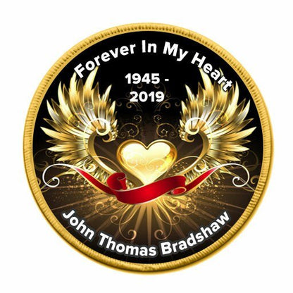 Your custom three lines of personalized text are beautifully imprinted alongside the featured artwork, making each patch uniquely meaningful. Finished with a coordinating golden stitched border and presented in a classic circular shape, this patch is a striking and dignified keepsake that honors a life remembered with love.