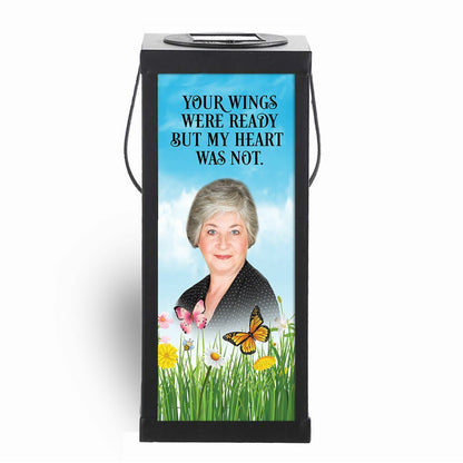The Funeral Program Site presents a unique, high-quality solar-powered memorial lantern, crafted with a durable metal frame and clear glass window panes. Each pane is printed with a vibrant watercolor spring landscape, complete with delicate butterflies set against a soft blue sky. Your submitted photo is seamlessly integrated into the background, creating a personalized and meaningful tribute. The front pane features two lines of your custom text beneath our elegantly scripted memorial title, “Your wings were ready but my heart was not,” making this lantern a beautiful and heartfelt way to honor the memory of a loved one.