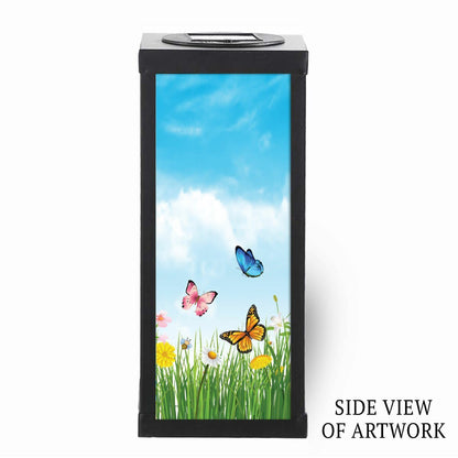 The Funeral Program Site offers our unique, quality made solar powered memorial lantern made of metal framing and glass window panes. Each pane is imprinted with a colorful background with your personalization on the front of the pane for a custom finish. Our design offers a watercolor spring landscape with butterflies accents set upon a blue sky backdrop with your submitted photo merged into the background. The front pane provides your 2 lines of text beneath our elegantly written memorial title word art which reads "Your wings were ready but my heart was not".