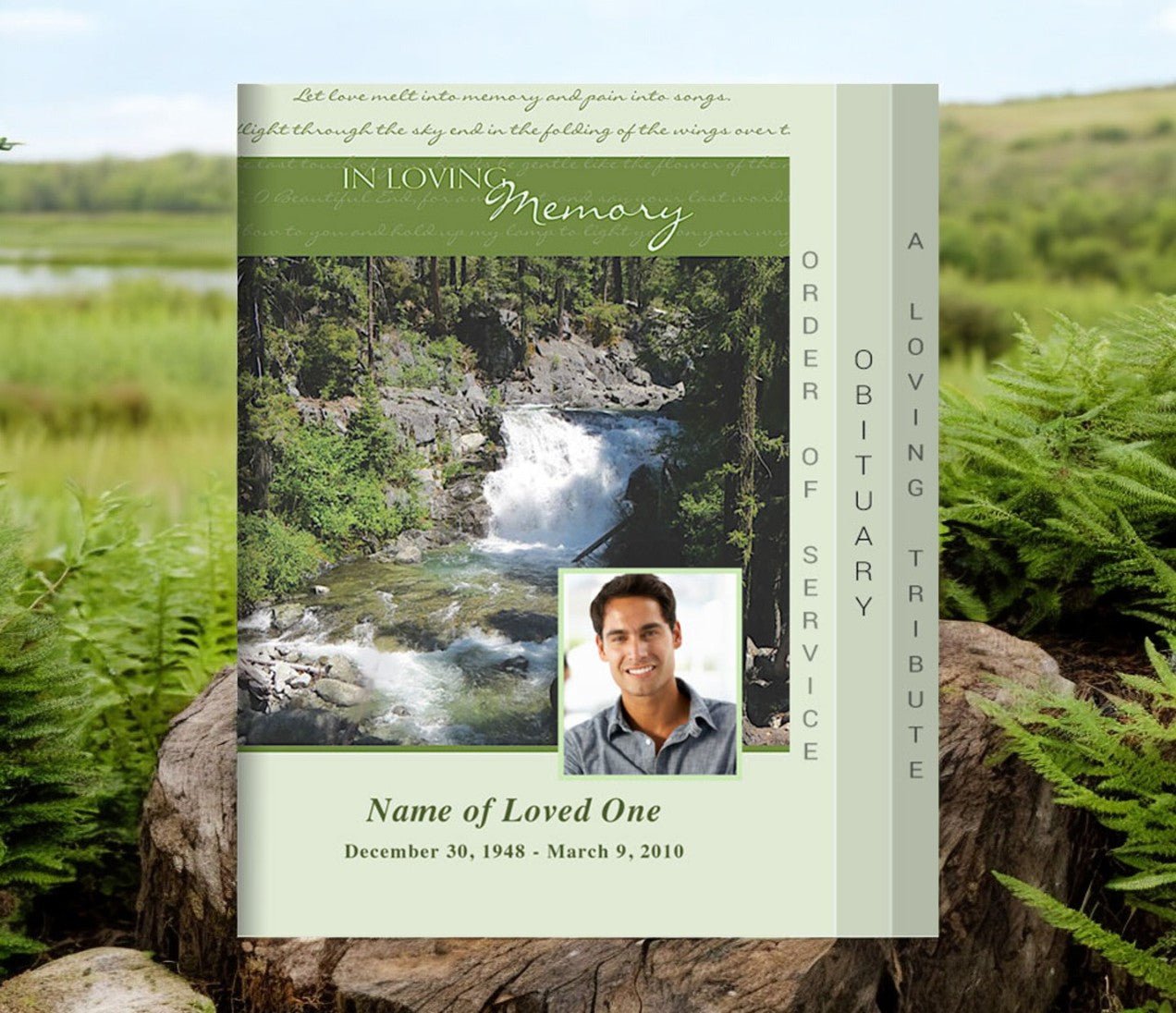 The Winsome 8-Sided Graduated Funeral Program Template offers a tranquil and nature-inspired design, ideal for celebrating the life of someone who cherished the outdoors. The front cover showcases a serene landscape scene, framed with top and bottom borders that include a delicately scripted memorial poem. This peaceful setting creates a heartfelt atmosphere for displaying a favorite photo and personalized text. The Winsome 8-Sided Graduated Funeral Program Template provides a spacious and elegant format for sharing meaningful content.