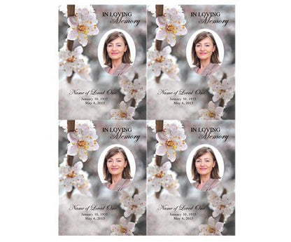 The Winter Small Memorial Card Template features a lovely floral blossom display, capturing the beauty of nature during the winter season. The delicate flowers are thoughtfully arranged, creating a serene and peaceful tribute to a loved one. The soft pink and gray hues in the design evoke a sense of calm and tranquility, making it a fitting memorial.