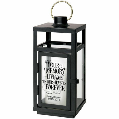 From The Funeral Program Site, this beautifully crafted black metal memorial lantern stands 10 inches tall and offers a timeless way to honor a loved one’s memory. The front glass window pane is inscribed with the heartfelt phrase: “Your memory lives on in our hearts forever,” delicately displayed in our signature word art style. Inside, a flameless LED candle adds a soft, flickering glow, creating a peaceful and comforting ambiance.
